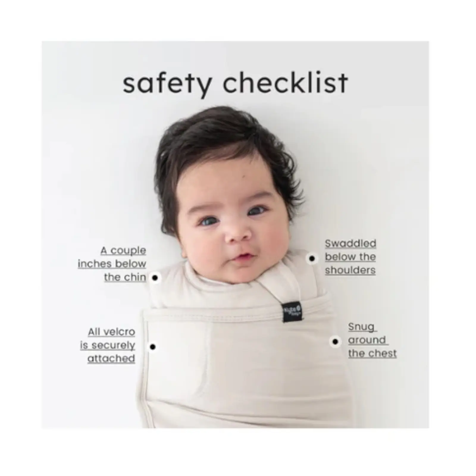 • Fully removable swaddle wrap attached to the sleep bag via Velcro, which allows for different positioning of the swaddle as baby grows.