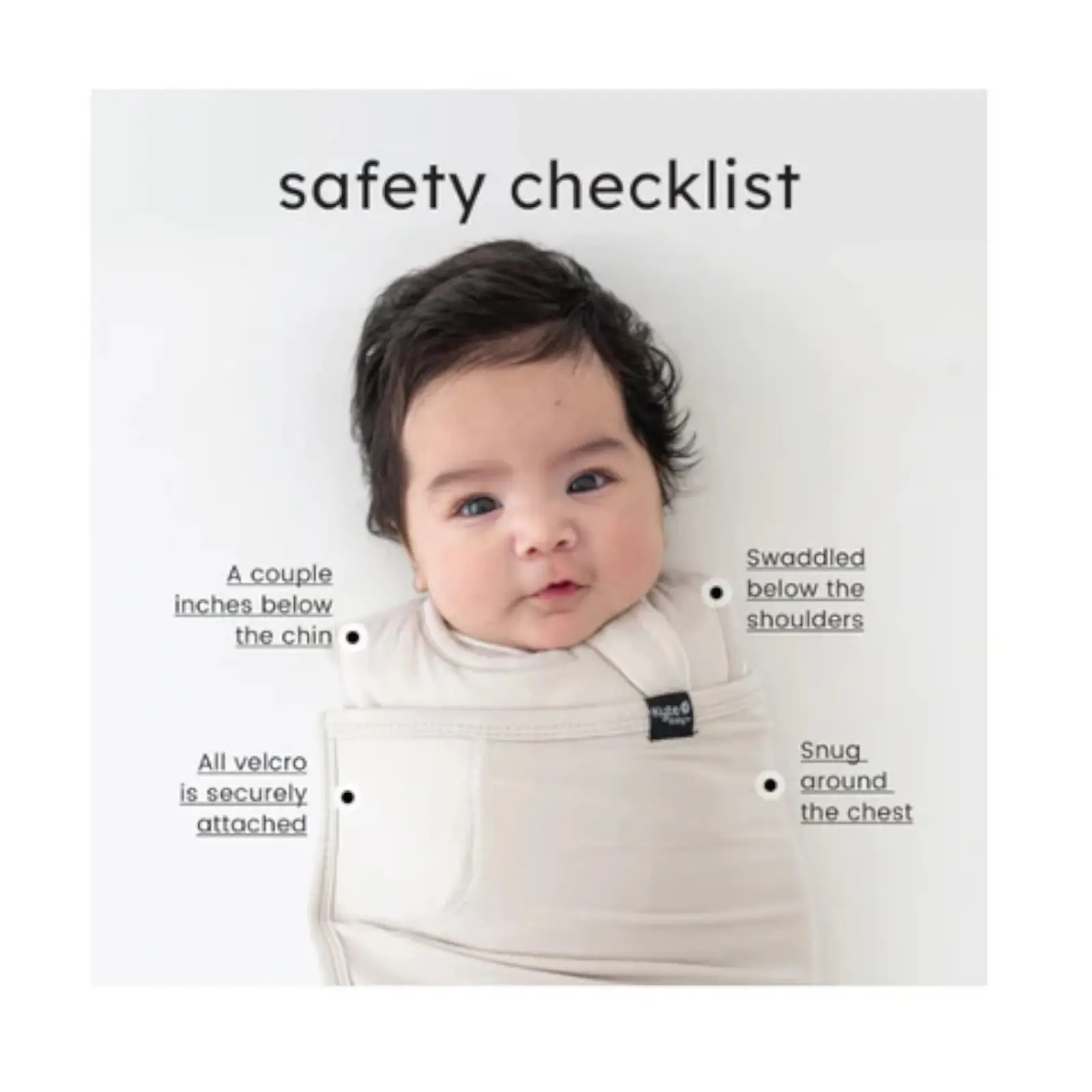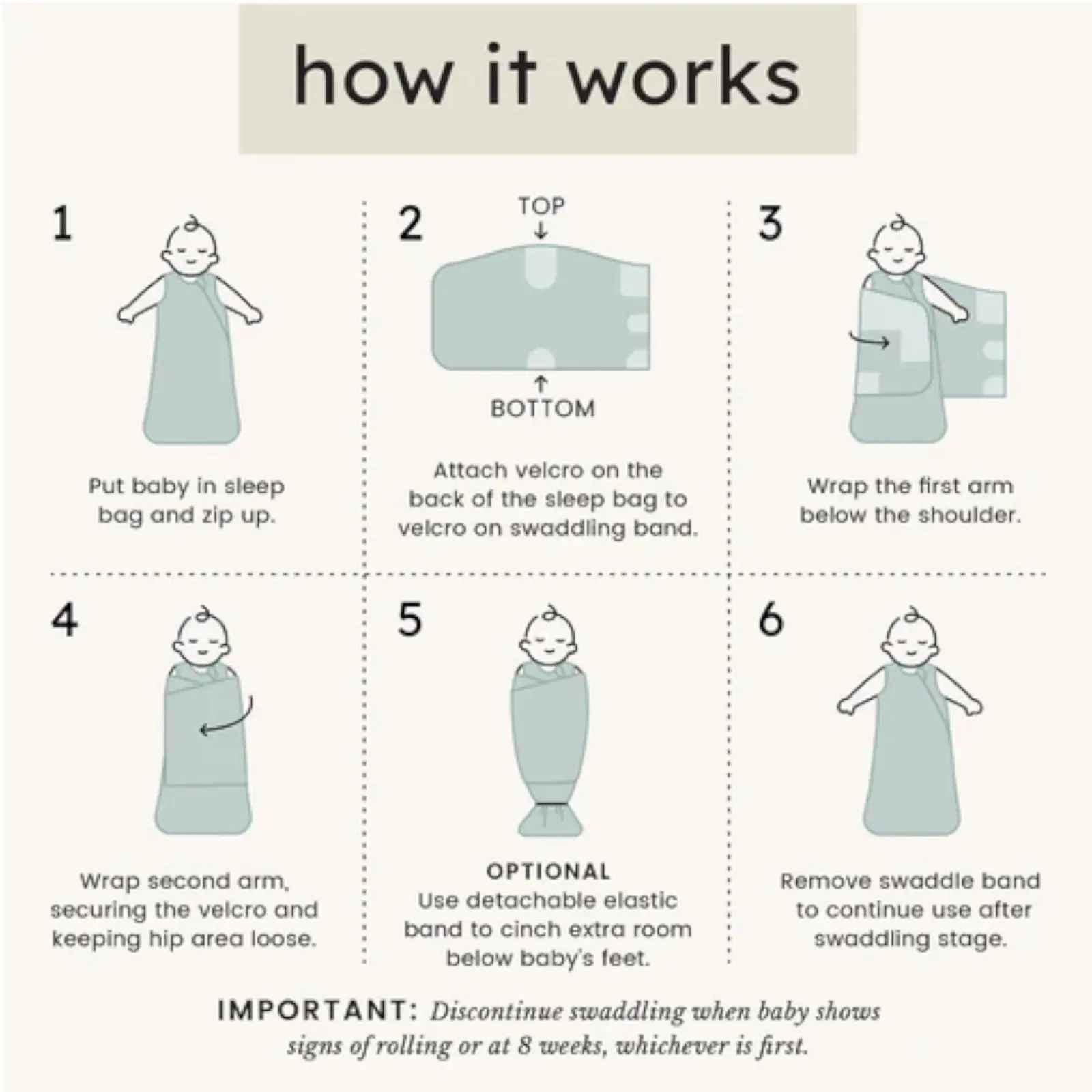 Our Sleep Bag Swaddler is an all-in-one sleep system that comforts your baby from the newborn stage to the next. Made from our signature bamboo rayon, our patent-pending sleep bag swaddler functions as both a swaddle and a 1.0 sleep bag. The attached swaddle wrap features a Velcro closure for a secure and adjustable fit, and is fully removable once swaddling is no longer recommended. There’s also a removable elastic loop that is fastened with a snap closure that can be placed around the bottom of the sleep bag. The additional step of tightening the sleep bag helps for little ones who haven’t fully grown in to their new sleep bag yet. Underneath the wrap is our award-winning sleep bag.