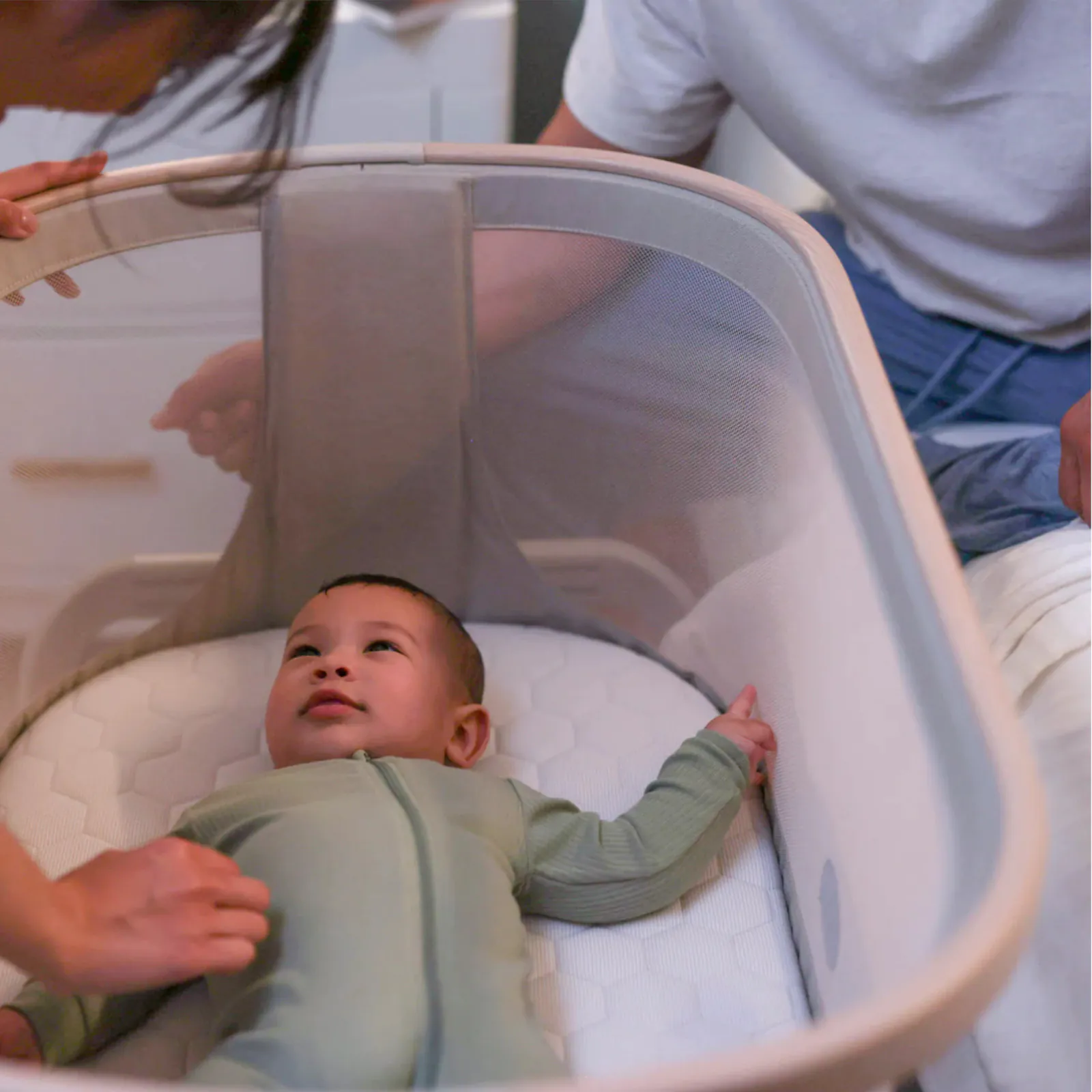 The supportive mattress offers baby just the right amount of comfort whether it’s for a short snooze or a full night’s sleep. Breathable mesh sides let air flow and allows you to feel connected.