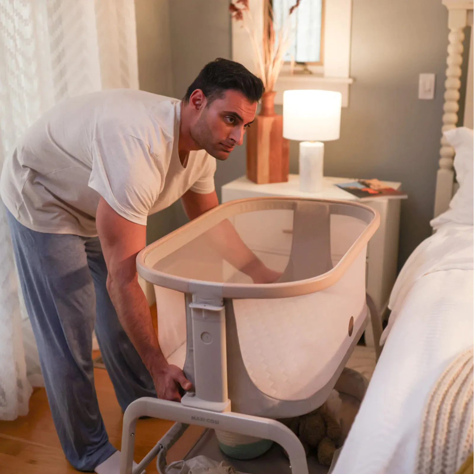 Make bedtime easier with the Maxi-Cosi Iora Baby Bedside Bassinet Designed for comfort and convenience this portable baby bassinet features a supportive mattress perfect for nighttime sleep or daytime naps The breathable mesh sides ensure airflow and allow parents to keep an eye on their baby